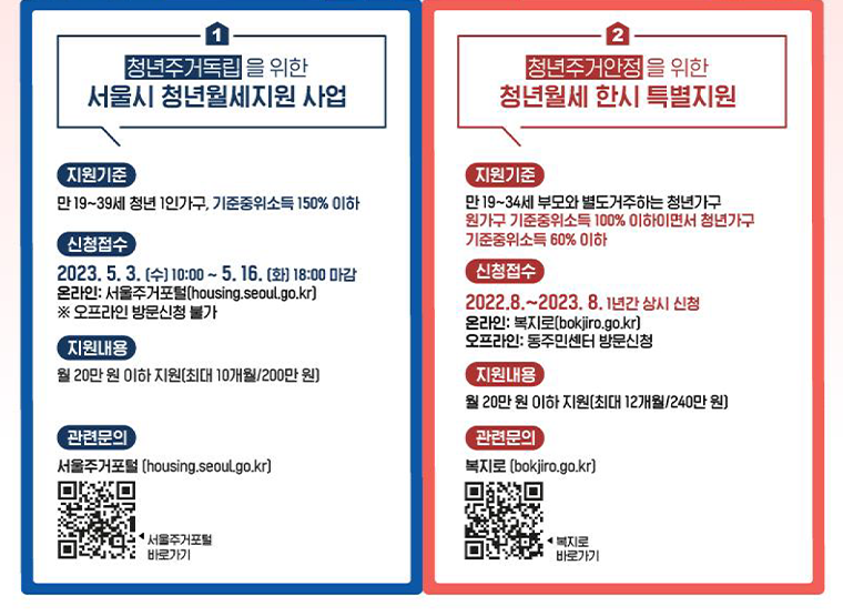 아울러 서울시는 코로나19 등으로 인해 최근 주거비 부담이 더욱 커진 주거위기 청년을 돕고자 지난 8월부터 국비를 지원받아 ‘한시 청년월세 특별지원’도 접수 중입니다. 신청은 복지포털 누리집인 ‘복지로’ 또는 동주민센터에서 가능합니다.